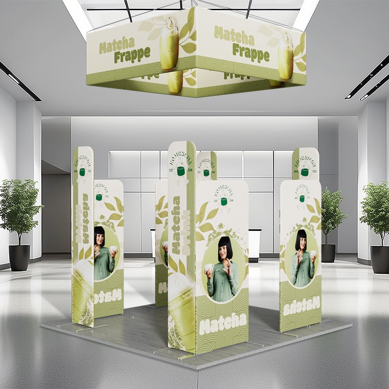 Unique Design – Square hanging banner with staggered banner stands create a bold, eye-catching display.