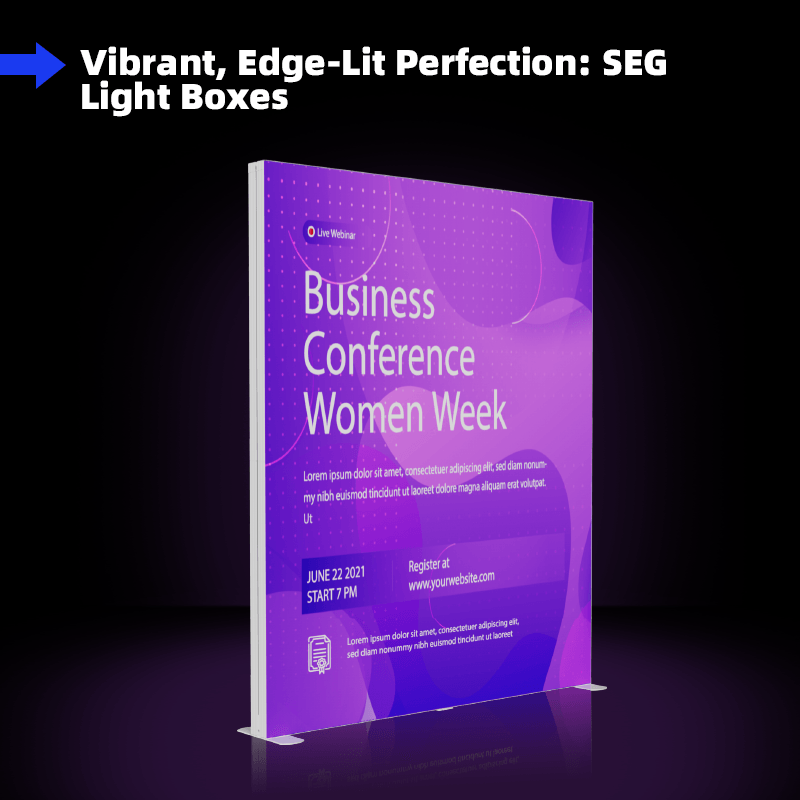 This upgraded SEG light box backdrop goes beyond the traditional single-sided backlit display. It is illuminated with reliable and energy-efficient LED edge lights, delivering vivid and consistent brightness. Each kit includes: 2 custom printed SEG graphics (one for each side), a sturdy aluminum frame, and LED lighting. By installing two single-sided graphics on both sides of the frame, it creates a double-sided display effect—more flexible and practical than conventional double-sided printing.