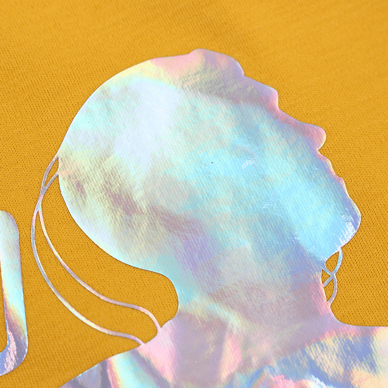 You can customize your t-shirts with our laser printing technique, which can create a holographic effect on the fabric and reflect light and changes color depending on the angle and the lighting. You can print your logo, design, or text on different locations of the t-shirt, such as the front, back, or sleeve. You can also choose from different fonts, colors, and styles to make your t-shirts unique and attractive.