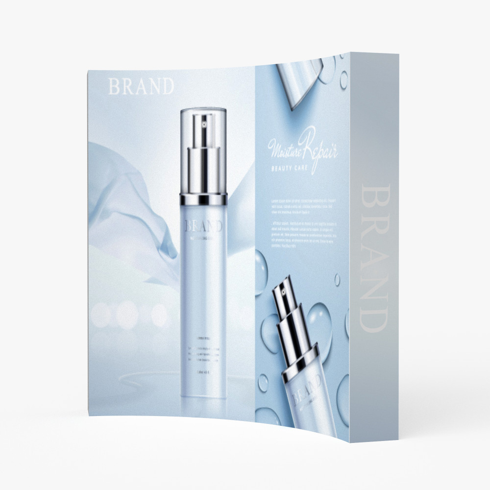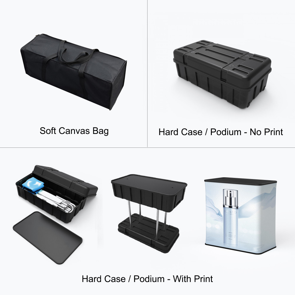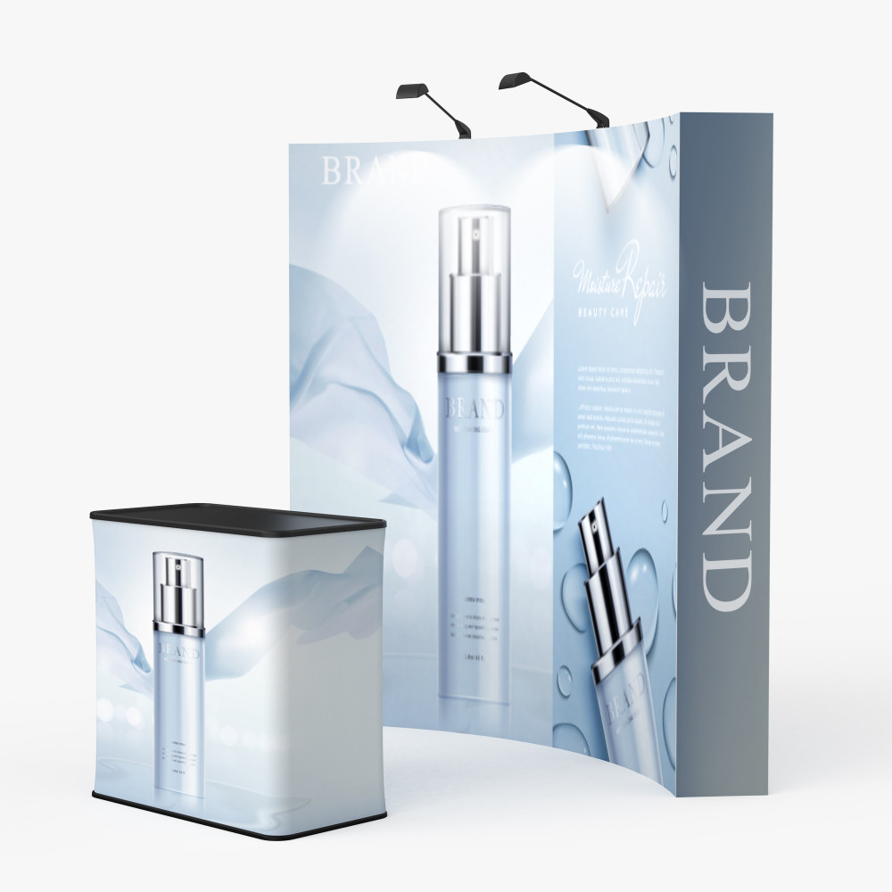 Tradeshow fabric display for exhibits and backdrops Options for 8′ and 10′ tradeshow stalls Concave curved shape to draw in customers Single sided – dye-sub tension fabric print with printed end caps Accordion style hardware·- expands for display Carry bag included – Hard case / Podium options available