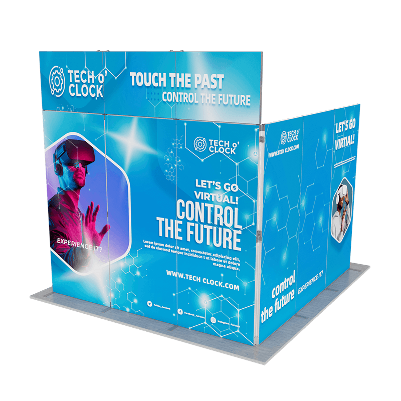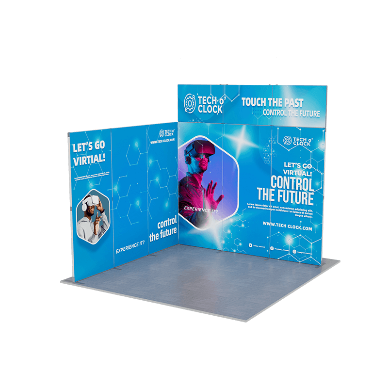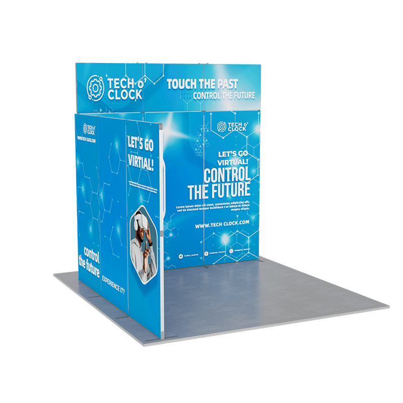 This innovative display kit includes a large back wall, a side panel of the same size connecting at a 90-degree angle, and a striking gateway billboard positioned above the back wall, creating a cohesive and attention-grabbing exhibit.