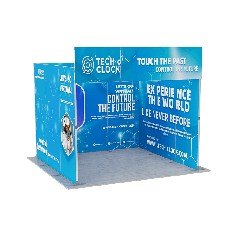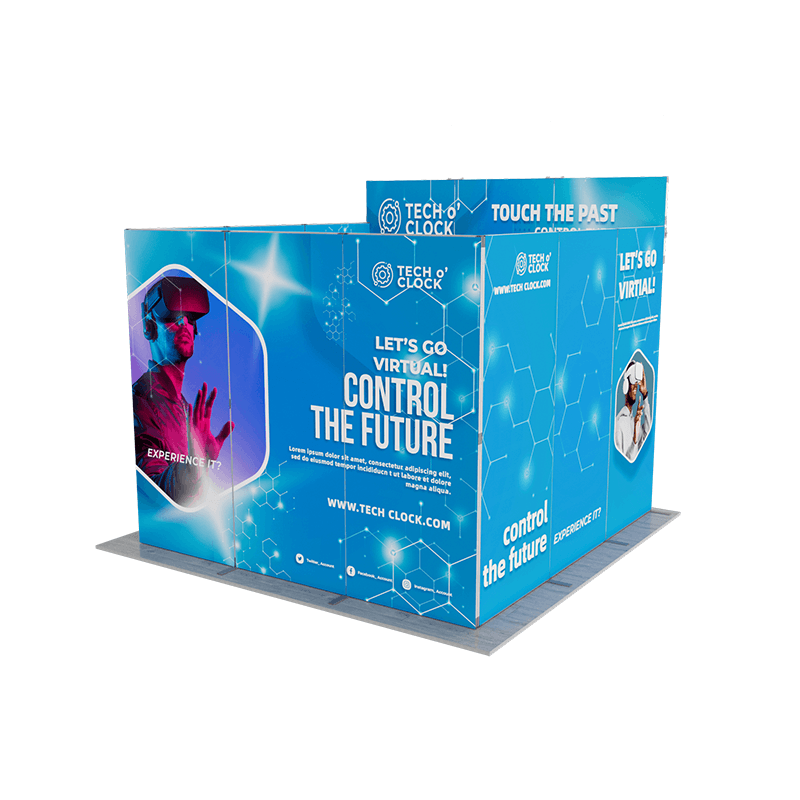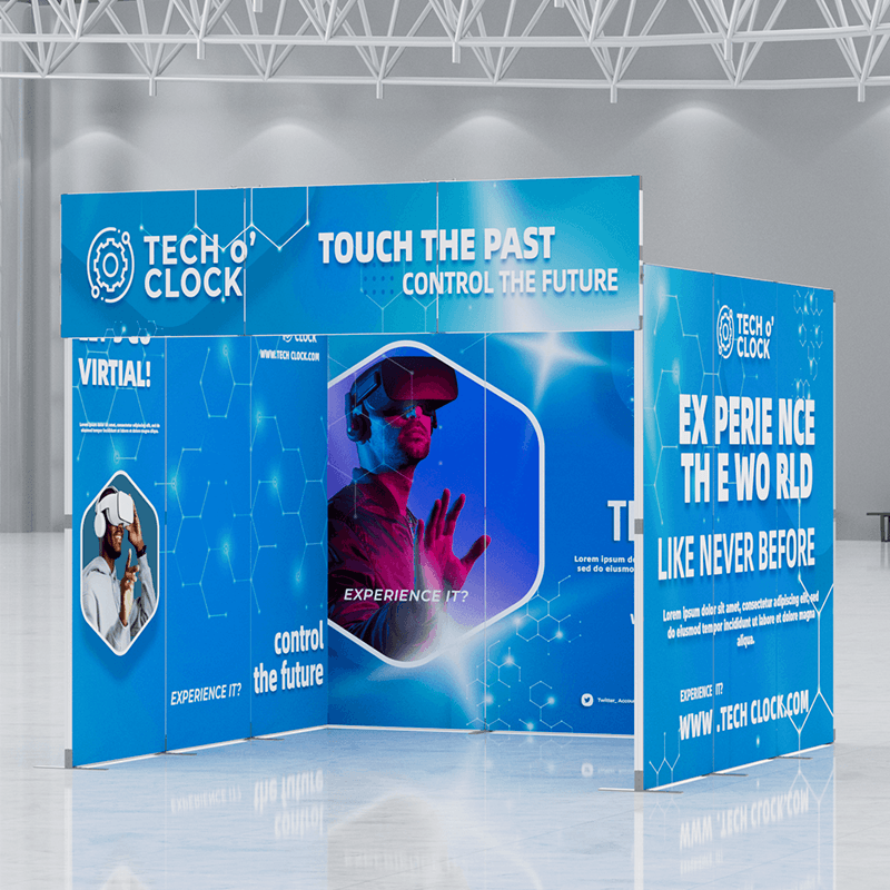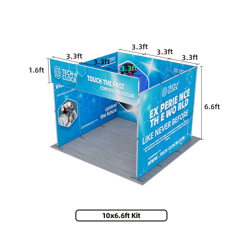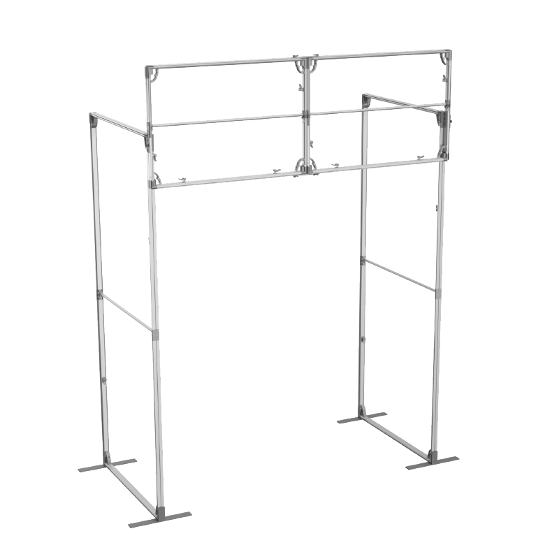 This innovative display system includes a main backdrop wall, two side panels, and a overhead header. The main backdrop wall serves as the centerpiece of your display, providing a large, uninterrupted canvas for your graphics and branding. Two side panels of the same size as the backdrop wall extend the visual impact of your display, creating a cohesive and immersive environment. And the overhead header sits above the main backdrop, providing additional space for branding, logos, or messaging that will catch the eye of passersby.