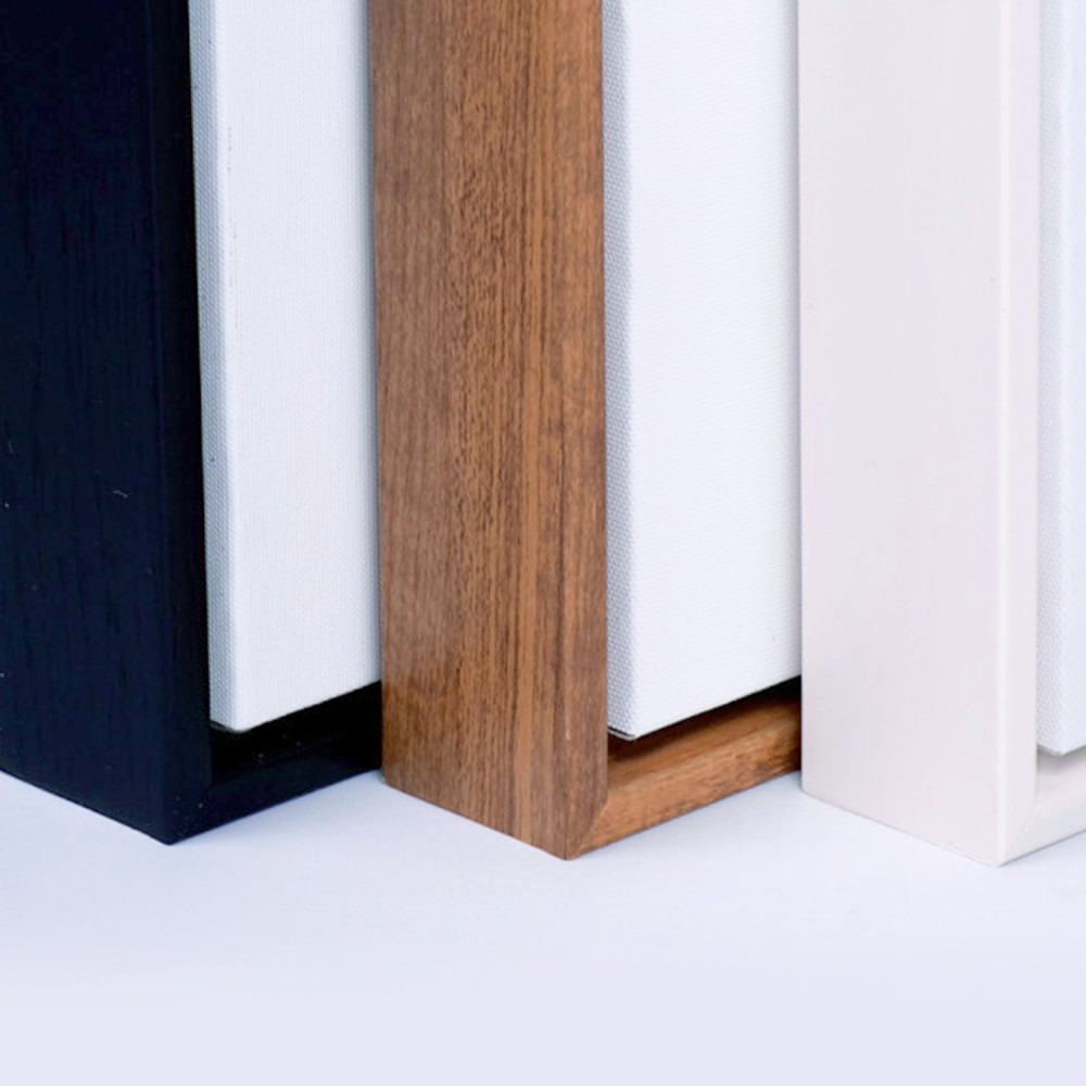 Framed Canvases add a contemporary flair to our wall art offers. Printed canvas material is mounted on a hard backing board and then inset into our framing. The frame is 1.25″ deep and the frame face is .25″, the canvas is inset .25″ all around for a clean and elegant look.
