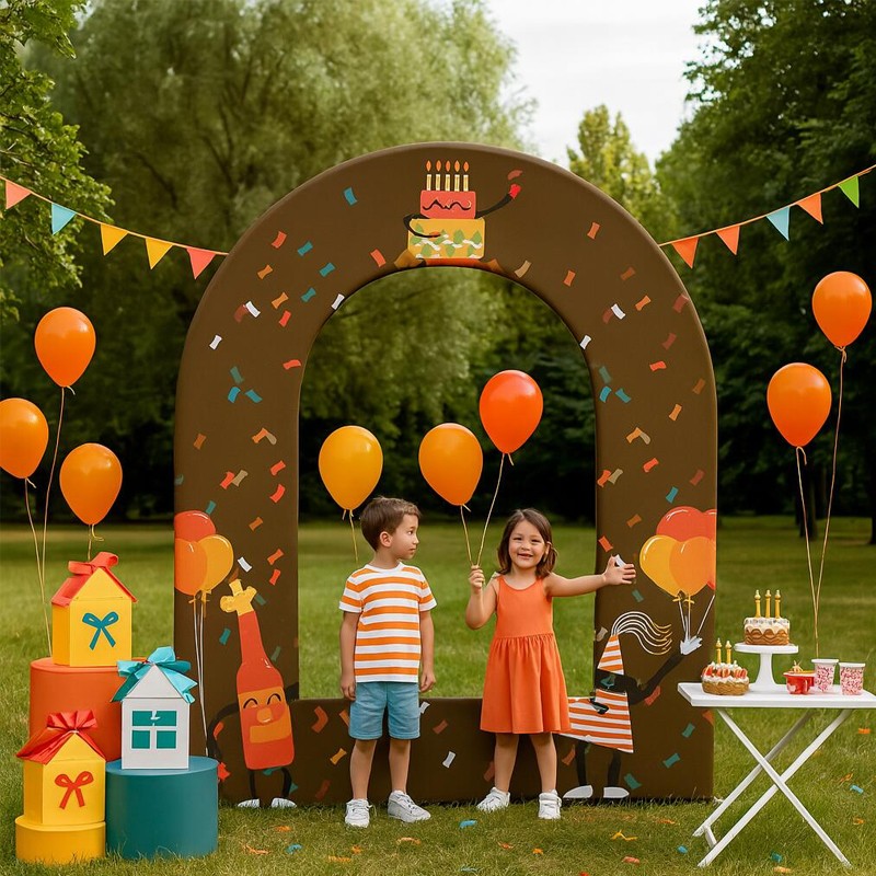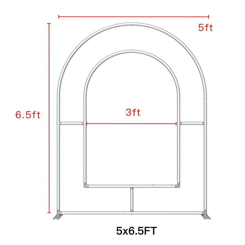 The open arch stand allows for creative enhancements—the center opening can be decorated with balloons, flowers, garlands, or lights to match your event theme. The frame assembles effortlessly without any tools, thanks to elastic ropes pre-attached inside the round aluminum tubes. The pillowcase-style tension fabric graphic slides on easily for a snug, wrinkle-free fit.