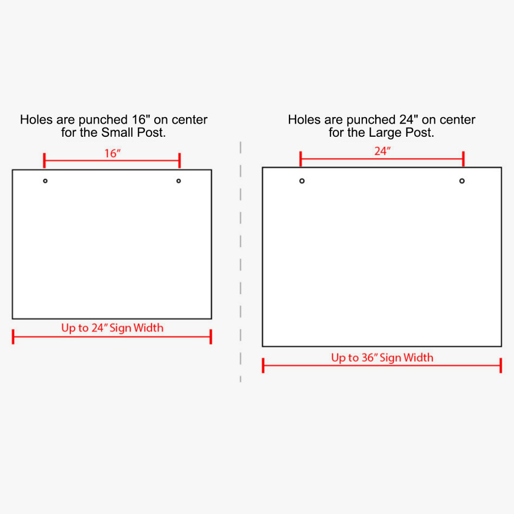 We offer Double Sided Aluminum Sandwich Board prints for long lasting outdoor graphics. Sizes available include: 24″ x 18″, 24″ x 36″ for the Small Post, 36″ x 24″ and 36″ x 48″ for the Large Post. Rider Signs are also available in 24″ x 6″ and 36” x 6”. Signs are pre-drilled for hanging from the Post Arm.