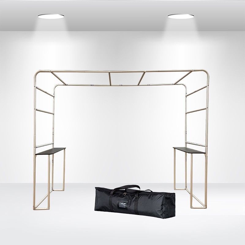 This frame applies to our Square Arch Trade Show Booth. It is easy to assemble and break down with no-tool due to the push-button designed aluminum tubes. And it is lightweight and portable. Each comes with a carrying bag for easy transport and storage.