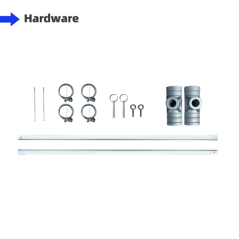 | Each street banner pole kit includes | Cross Bar (26.8”/33.5” in length) x2 | Mounting Bracket x2 | Stainless Steel Band x4 | Some Metal Rings & Pins |